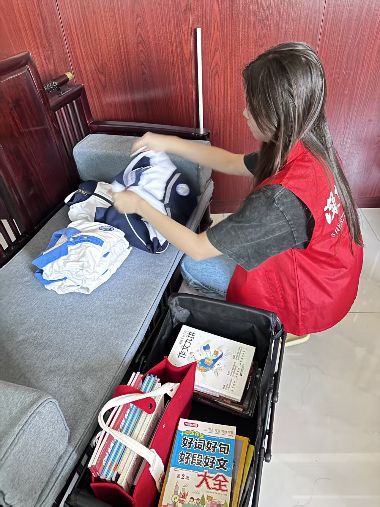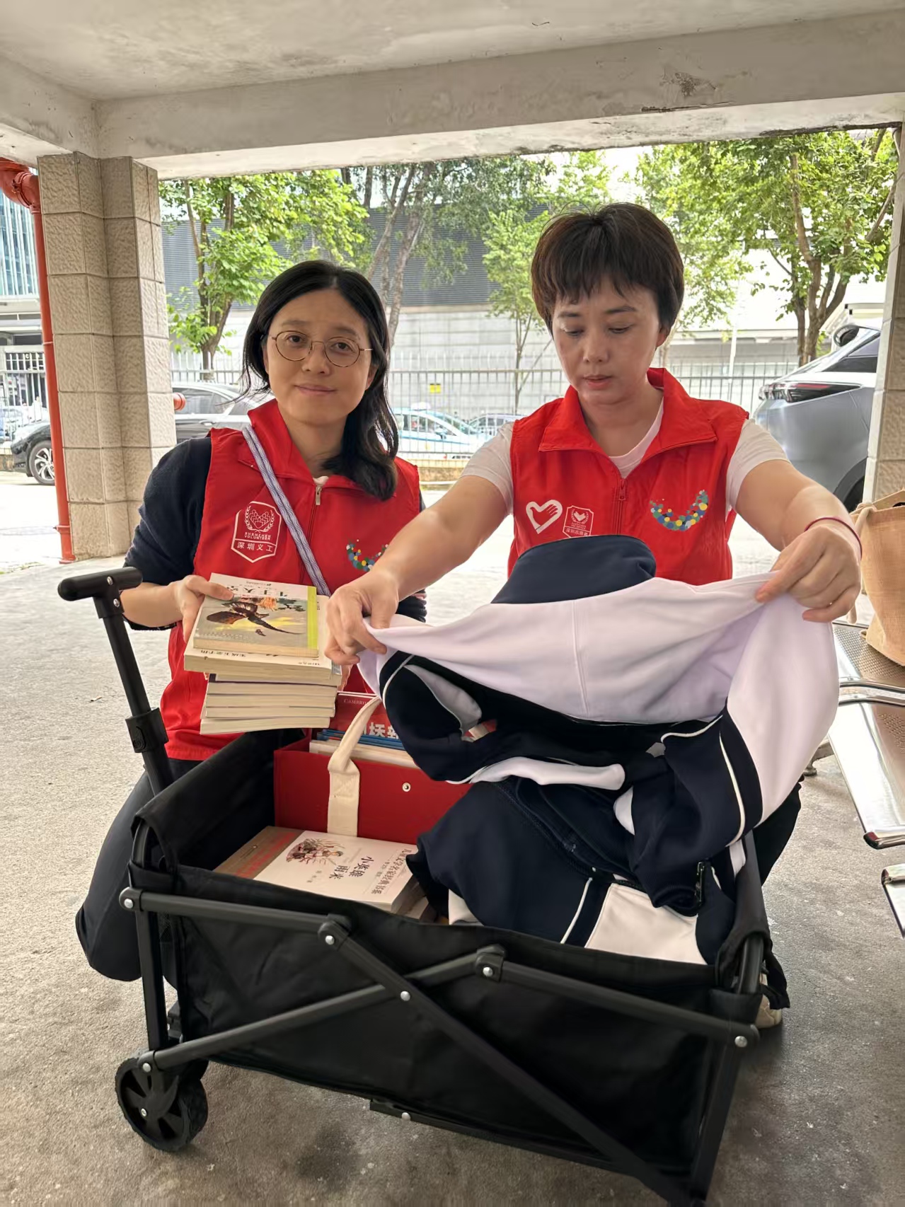线下端,为方便市民参与,活动推出“预约上门收集”服务:宝体站、福田站志愿者团队提前通过电话、社群接收捐赠预约,携带分类收纳袋上门整理闲置图书与衣物。截至活动当日,宝体站募集图书106本、衣物51件,福田站募集图书28本、衣物11件,合计134本图书、62件衣物将经消毒分拣后,送往粤北山区学校与社区图书馆。