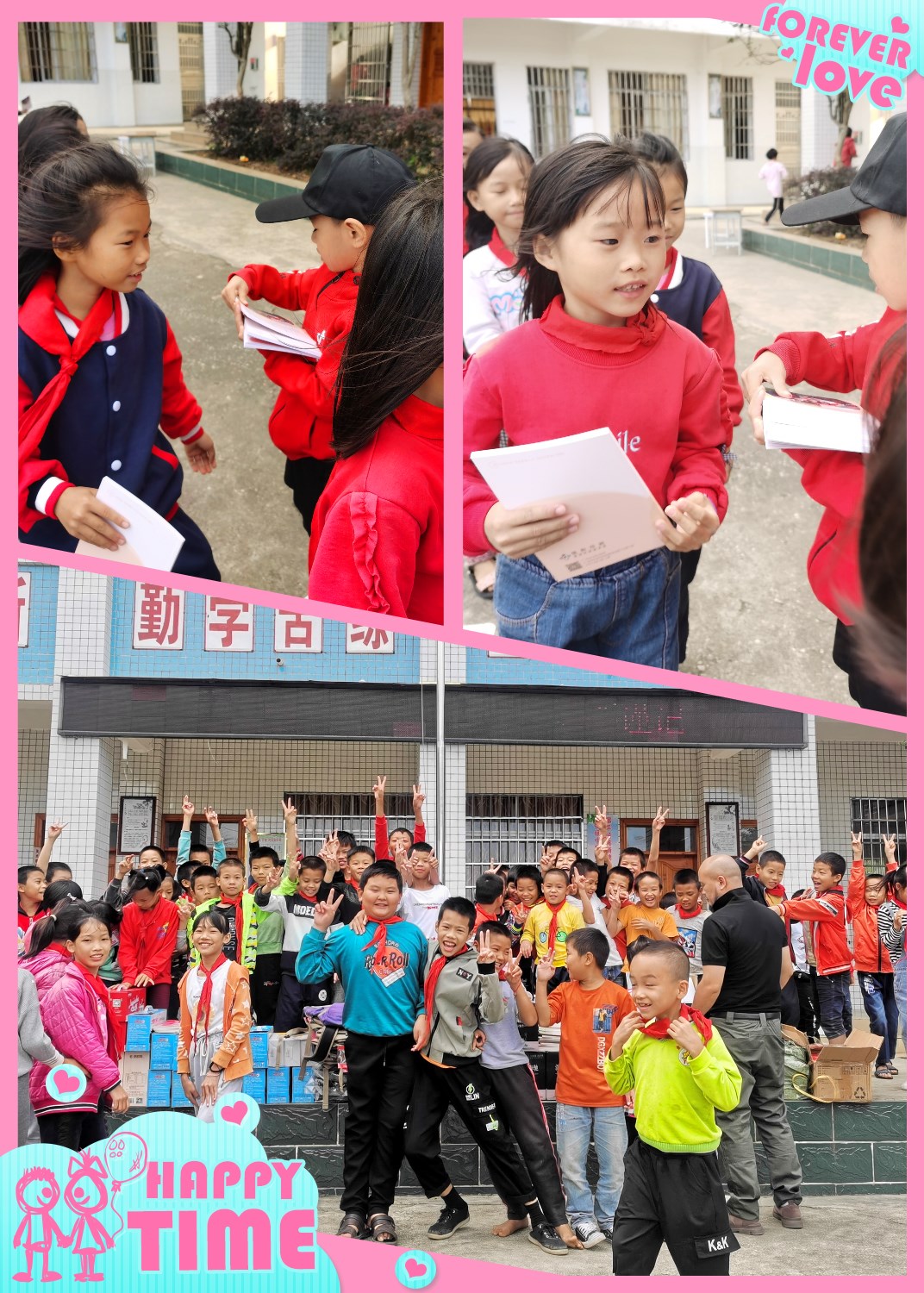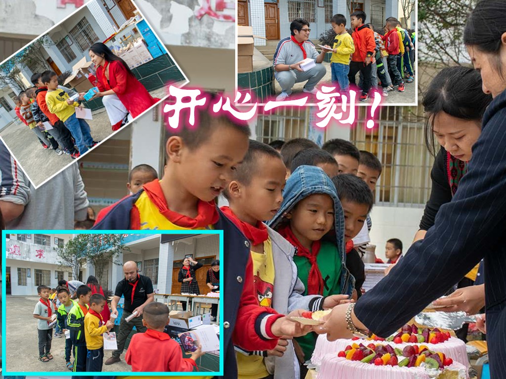 据悉,我们志愿者早上六点从深圳出发,驱车近五百公里下午一点才赶到学校。在学校林校长招呼下,简单在学校食堂吃饭。三下五除二搞定,顾不上休息,他们就在学校老师协助下,把随车带来的物资一一搬到活动现场。这时已近二点,孩子们刚午休结束冲出教室,看到堆满舞台的各种物品,有36色的水彩笔、多功能圆规三角板米尺、名车奔驰双肩背包、六层的生日蛋糕等,孩子们沸腾了。看我们志愿者在拍照,对着镜头做起各种可爱的姿势,不时有孩子问志愿者“叔叔,这些是送给我们的吗?”当听到坚定的回答“是”时,孩子们开心跳起来,真是一群天真无邪的孩子。
