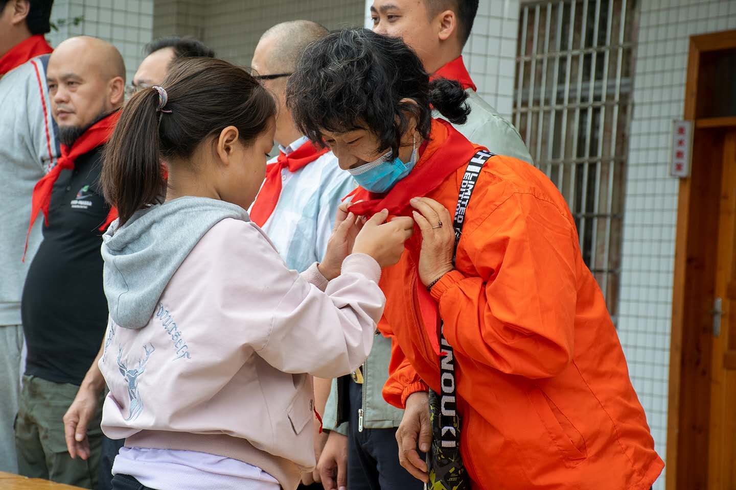 仪式开始,首先由少先队员代表为我们志愿者及与会的领导嘉宾配戴红领巾,看到孩子们把鲜红的红领巾熟练的系到我们脖子上,一个个脸泛红晕,仿佛又回了孩提时代。