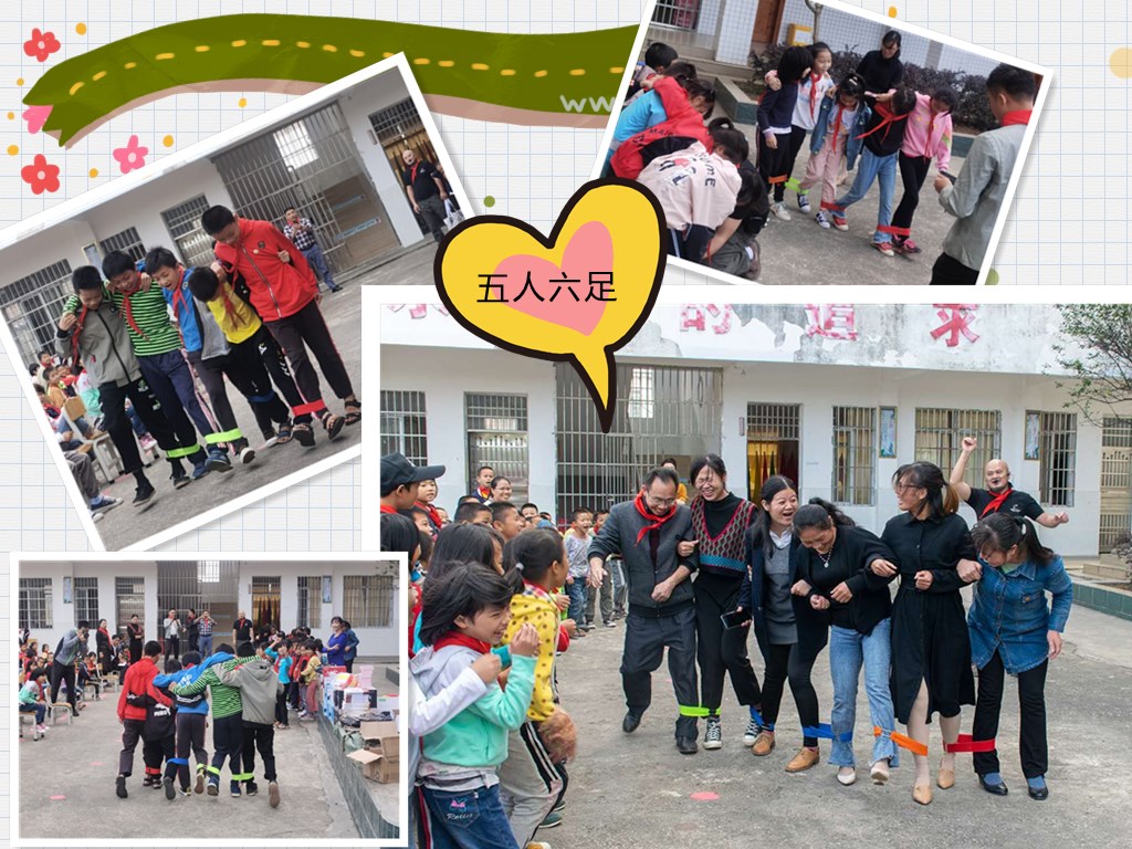 强哥不亏是孩子王,第一个互动游戏是“五人六足”游戏,他首先从六年级选出5名代表,为弟弟、妹妹做示范如何玩?同时让各班班主任老师选出各班5名代表,并为他们系上绑带,开始玩起了PK比赛,在一片又一片“加油、加油”欢呼声中,四年级以22.3秒的成绩拿下了冠军、五一班为亚军、三年级第三名。志愿者们分别为他们颁发了气排球、笔让本等作为奖品,但最高潮的还是强哥邀请林校长和五名老师一起玩“六人七足”,看到老师歪歪扭扭的样子,孩子们热情高涨,一边高呼“一二加油、一二加油”一边围上前看老师们游戏,这时操场已没有老师、学生之分,大家都沉浸在欢乐的海洋中!