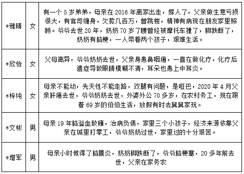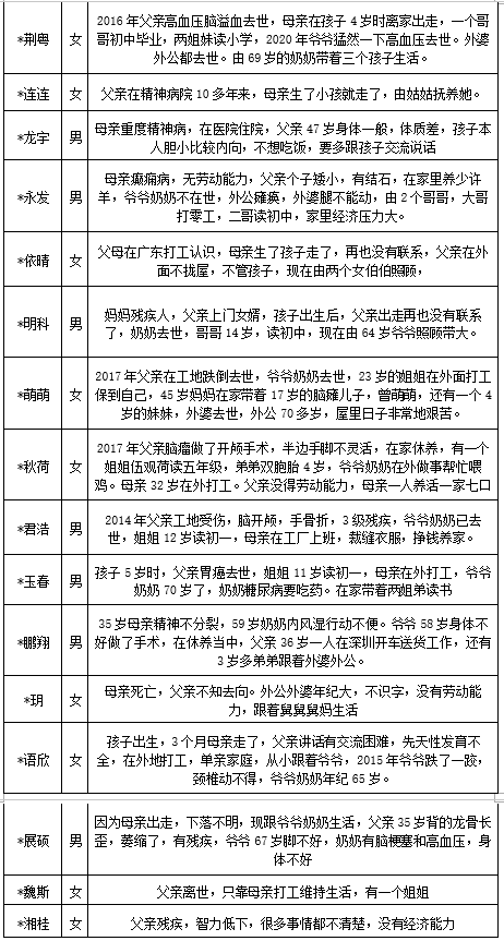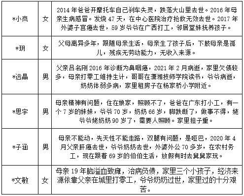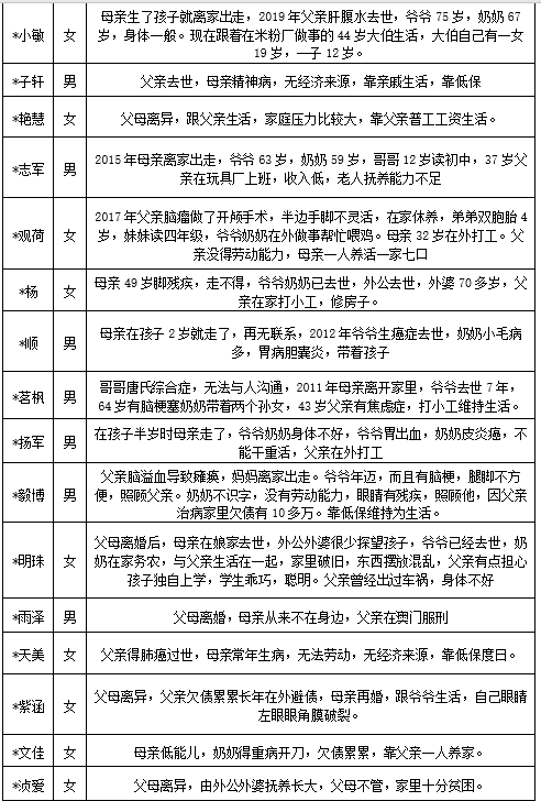 自开学以来,我们萱娅暖阳学校共招收了58名冷水滩区及周边困境学童,感谢社会各界爱心人士关心帮助,孩子们已经融入学校集体生活,为了孩子们更好的成长,希望大家更多的参与帮助我们,以下为学生家庭信息:
