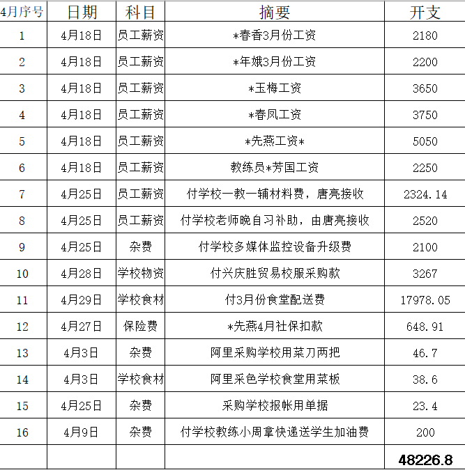 截止到2022年4月30日萱娅暖阳学校共支出551653.89元,见下表:
