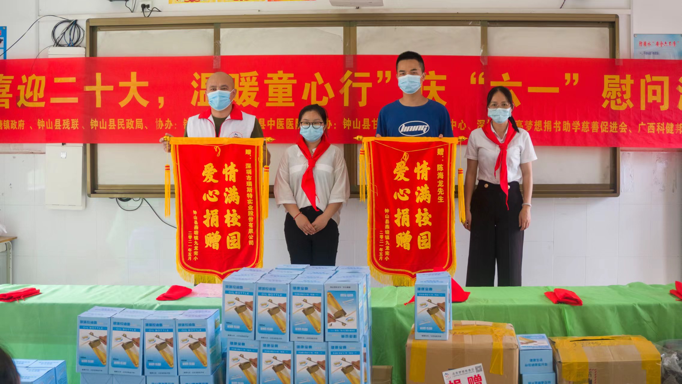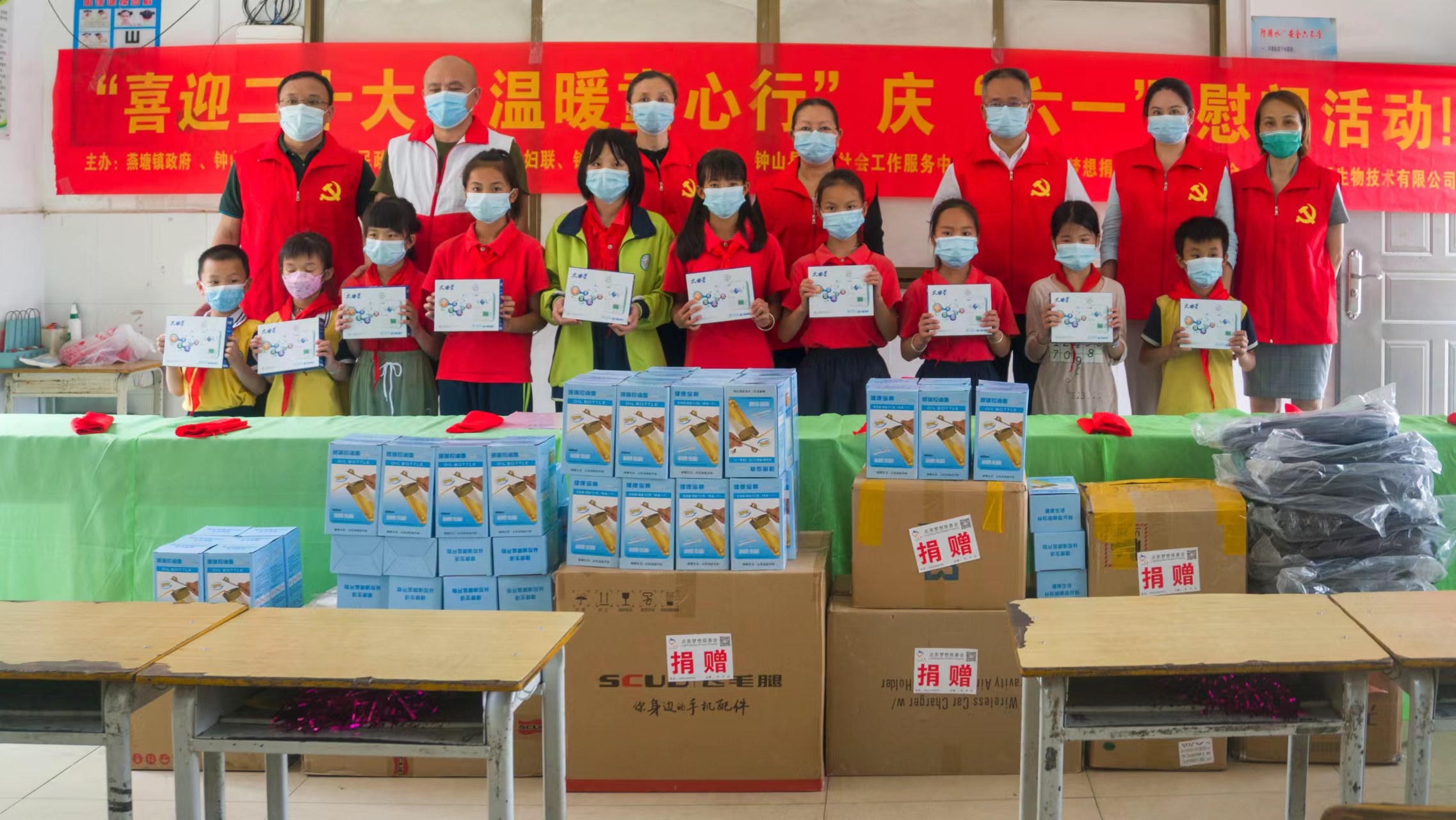 “喜迎2θ大,温暖爱心行”庆“六一”慰问公益活动!点亮梦想秘书长强哥在钟山县政协董玉玲副主席和钟山县中医院、残联、甘霖社工志愿者一行陪同下,为九龙村完小154名孩子赠送儿童智能牙刷、玻璃健康控油壶icon做为儿童节礼品希望孩子们做一个讲卫生爱劳动爱学习的好学生,并为10名优秀学生颁发文曲星复读机做为奖品。同时为全校11名老师发放双肩商务背包等慰问品感谢师恩!