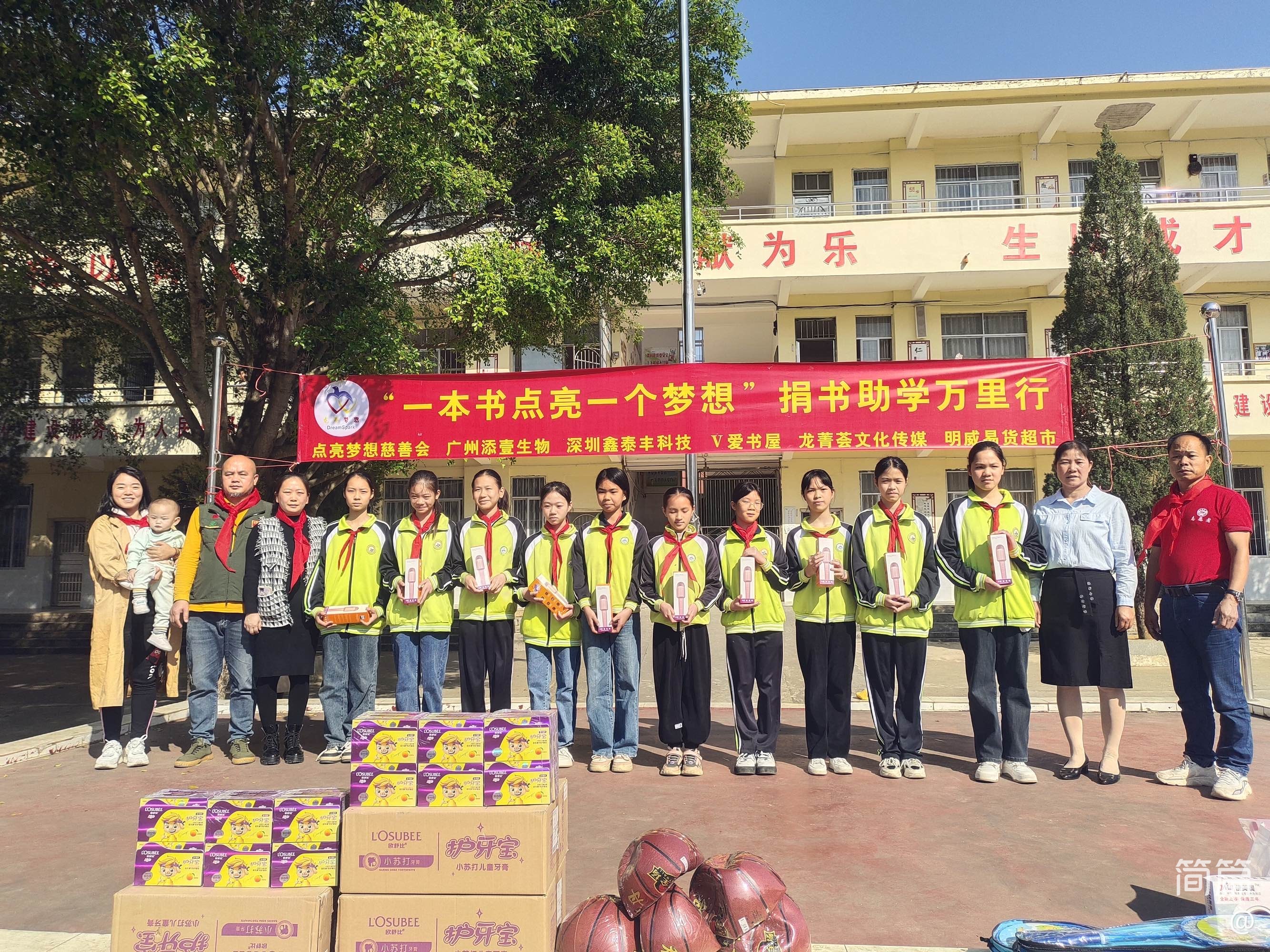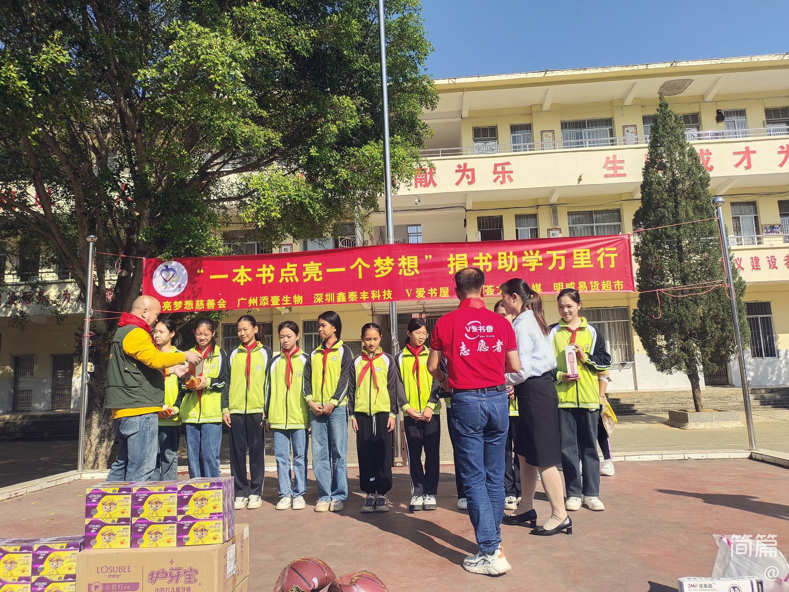 最后,志愿者们为优秀学生颁发了由深圳鑫泰丰科技公司提供的手持音箱话筒一体机作为奖品,并现场赠送了由广州添壹生物和明威易货等爱心企业捐赠的图书、牙膏、文具、体育用品等物资。"