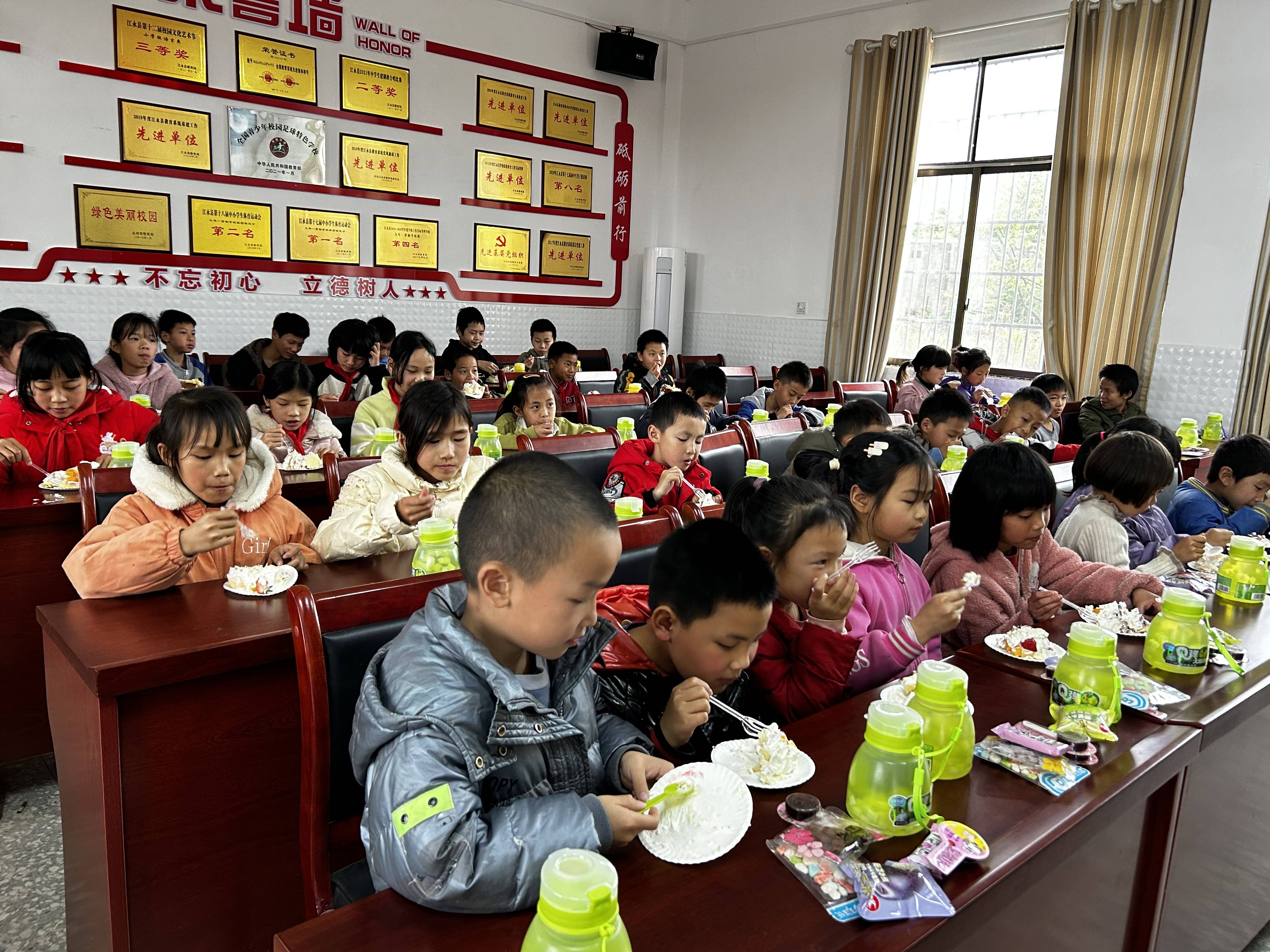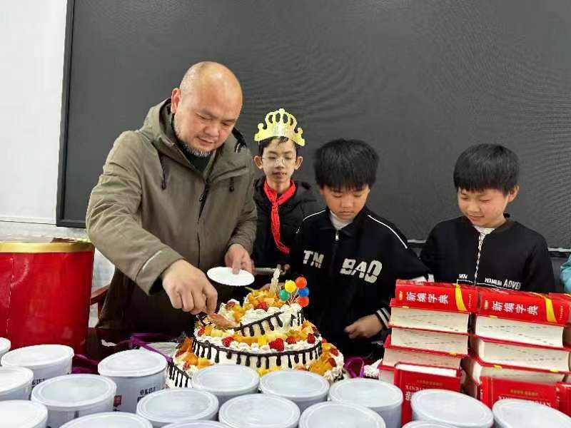 而强哥则以亲切幽默的方式与孩子们互动,他自称光头强,孩子们一声声“强哥、强哥”的呼唤,让整个活动现场充满了欢声笑语。活动的重头戏是生日会环节,强哥与董老师一同为四月份过生日的同学们戴上了生日皇冠,在徐校长的带领下,大家共同唱起了生日快乐歌。随后,强哥亲自为孩子们分发了蛋糕,并带领大家念感恩词,教导他们要懂得感恩与分享。