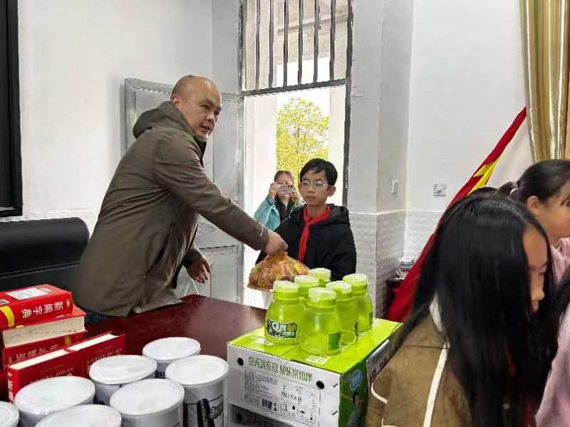 此外,强哥还为孩子们分发了精心准备的生日礼物,包括杯具熊书包、Q弹水壹饮料、新编新华字典以及海苔肉松卷等。这些礼物不仅丰富了孩子们的学习生活,也让他们感受到了来自社会的关爱和温暖。
