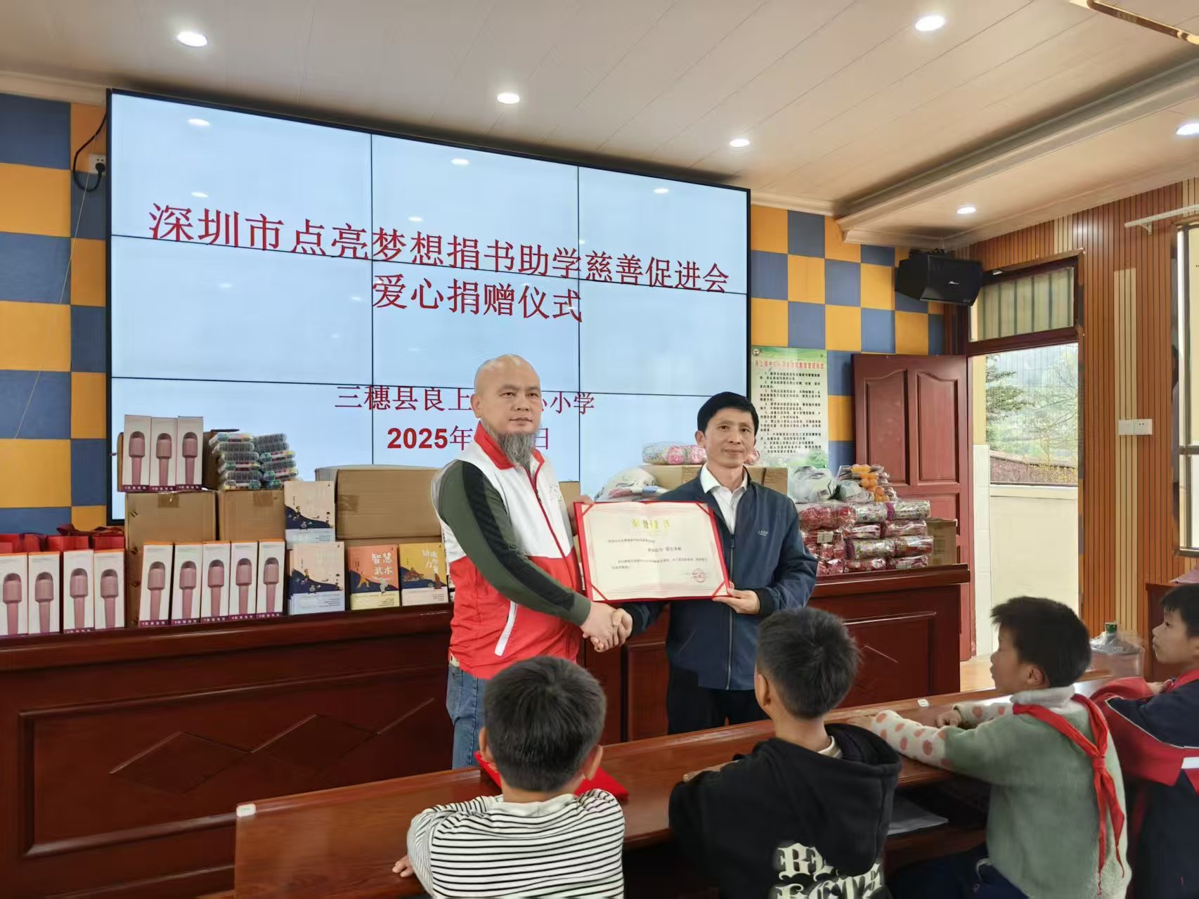 4月9日,深圳市点亮梦想捐书助学慈善促进会会长蒋湘南、董先燕一行驱车千里,从湖南永州奔赴贵州省三穗县良上镇中心小学,开展了一场饱含温情的爱心捐赠活动,为山区学子送去了知识与希望。