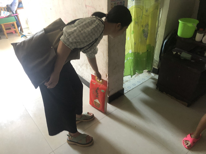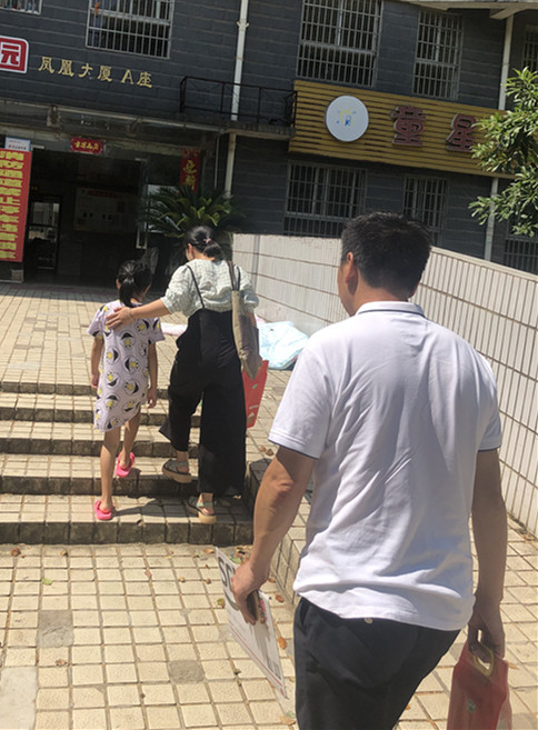 7月15日,高温38度,我们志愿者一行在副校长蒋敏带领下开始走访核实困境学生家庭,由于都在城区,蒋校长比较熟悉一会就到了,车还没停稳,凤凰大厦路边一位七八岁左右、穿着碎花裙子的小女孩冲着我们叫道,“你们是萱娅暖阳学校的老师吗?”我们点点头,“我一看你们就像老师,妈妈叫我下来接你们”,小女孩非常开朗、一点也不怯生,看到我们下车了,上前拉着蒋校长的手就领着我们往回走。