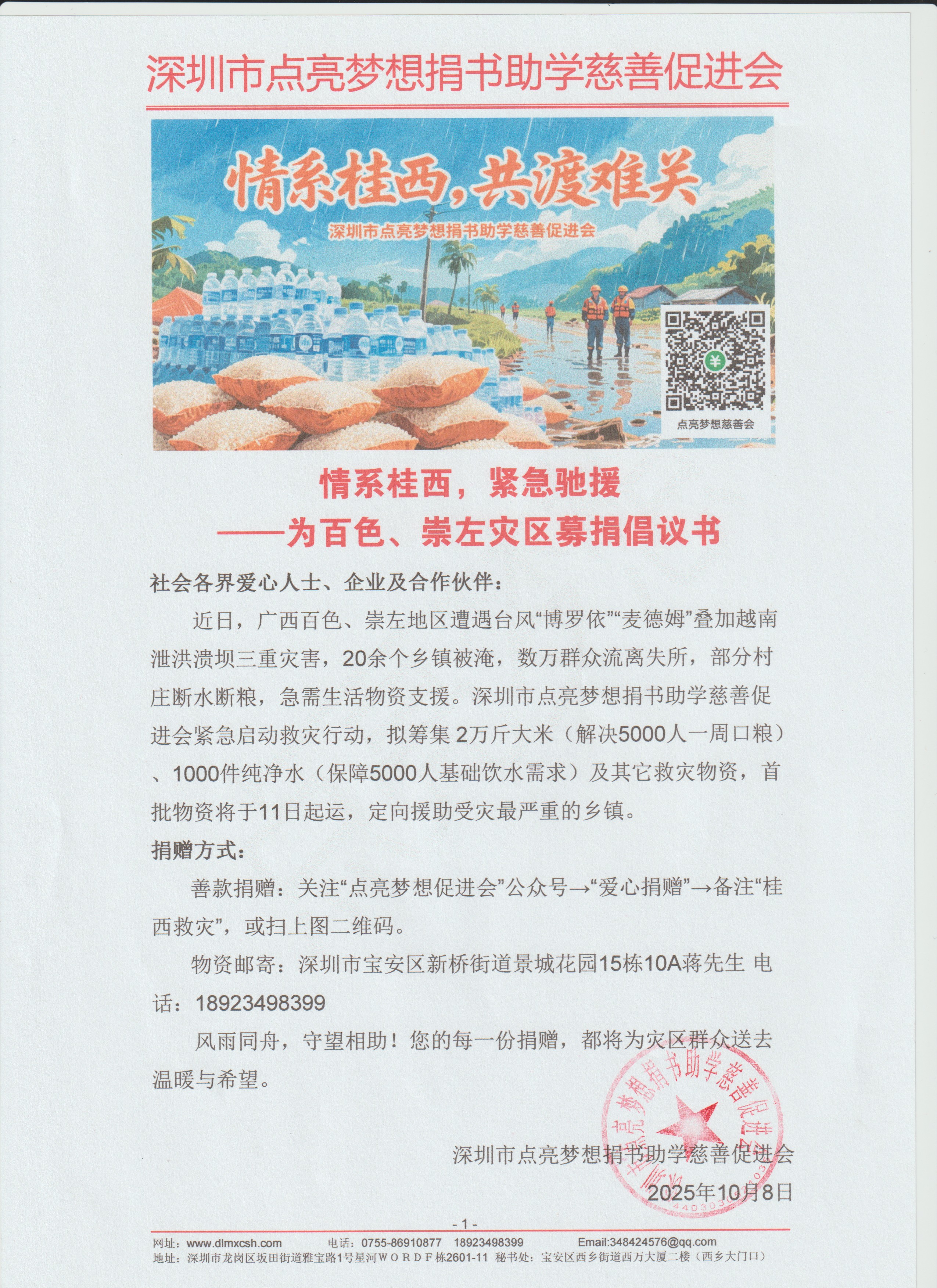 近日,广西百色、崇左地区遭遇台风“博罗依”“麦德姆”叠加越南泄洪溃坝三重灾害,20余个乡镇被淹,数万群众流离失所,部分村庄断水断粮,急需生活物资支援。深圳市点亮梦想捐书助学慈善促进会紧急启动救灾行动,拟筹集 2万斤大米(解决5000人一周口粮)、1000件纯净水(保障5000人基础饮水需求)及其它救灾物资,首批物资将于11日起运,定向援助受灾最严重的乡镇。