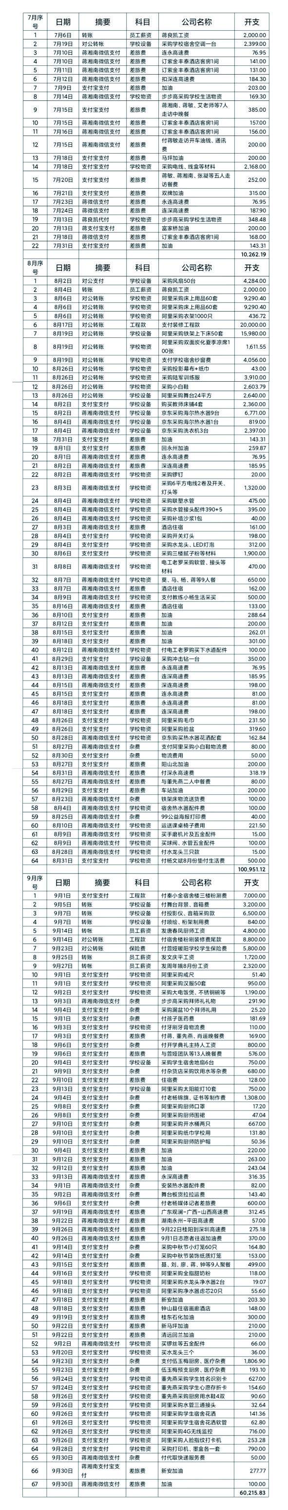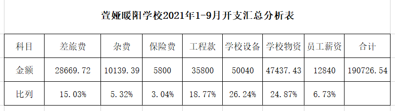萱娅暖阳学校我们911暖阳工程创办的第一所九年一贯制困境学童集中育养式学校,自2020年12月20日开始筹备,现已正式开学,招收了57名父母失去扶养能力的困境学童。项目截止到2021年9月30日,共收到捐款现金63万元(不含99公益捐款),其中萱娅品牌捐款60万元、盛兵捐款10000元、张坤捐款20000元;物资约12万元具体明细统计中,共支出现金190726.54元(不包括9月份工资及食堂配送),现公布如下: